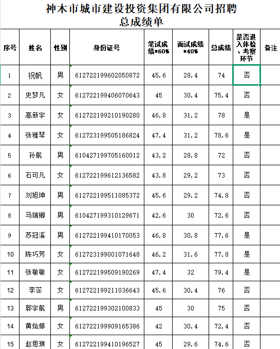 根据公告发布、报名、资格审查、笔试、面试等环节,现将总成绩及进入体检、考察环节人员名单公示如下: