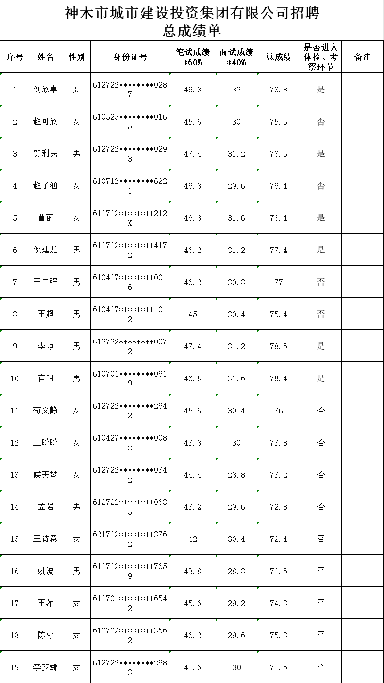 根据公告发布、报名、资格审查、笔试、面试等环节,现将总成绩及进入体检、考察环节人员名单公告如下: