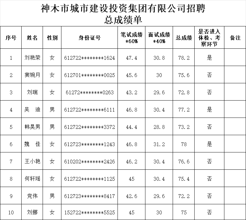 根据公告发布、报名、资格审查、笔试、面试等环节,现将总成绩及进入体检、考察环节人员名单公示如下: