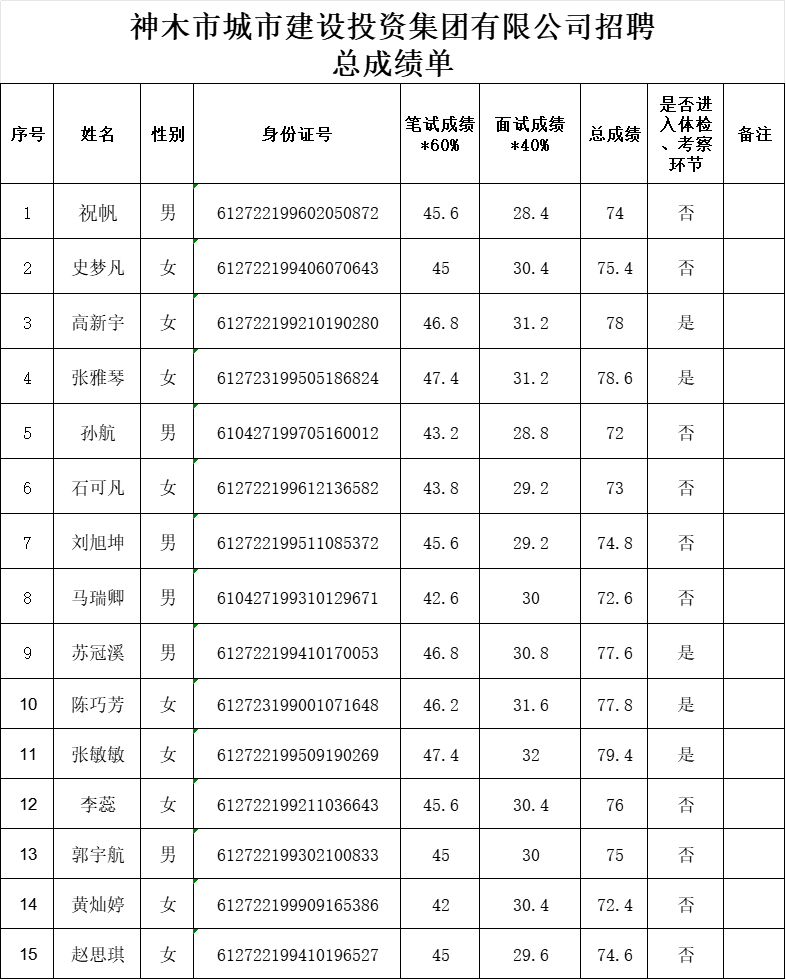 根据公告发布、报名、资格审查、笔试、面试等环节,现将总成绩及进入体检、考察环节人员名单公告如下: